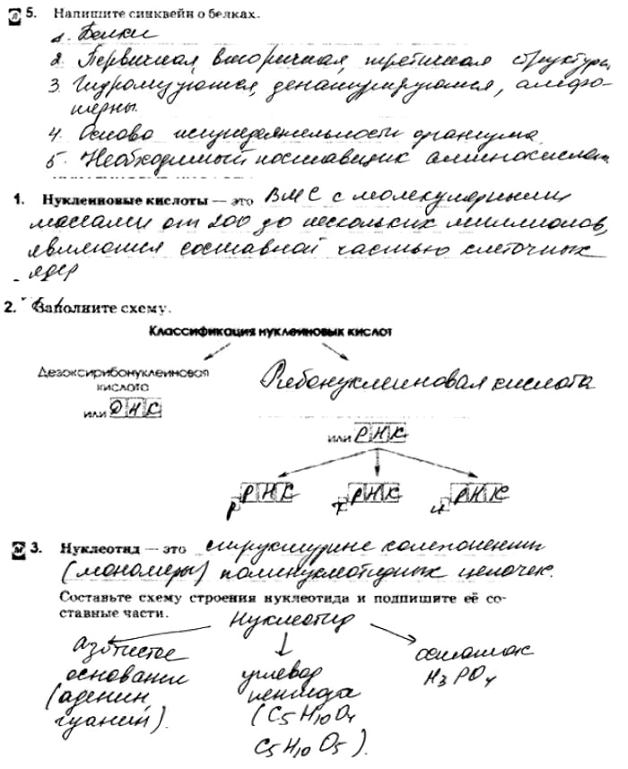5 Напишите синквейн о белках. НУКЛЕИНОВЫЕ КИСЛОТЫ Часть I 1 Нуклеиновые кислоты — это 2 Заполните схему. Классификация нуклеиновых кислот Дезоксирибонуклеиновая кислота или _ _ или _ _ _ 3 Нуклеотид — это Составьте схему строения нуклеотида и подпишите её составные части.