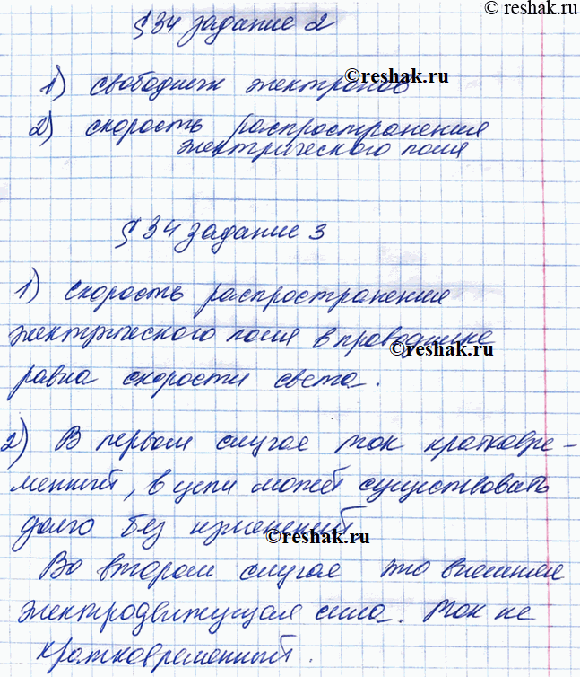 Ответьте на вопросы. 1) В проводниках электроны проводимости движутся направленно не так уж быстро: их скорость — несколько миллиметров в секунду. Почему же электрическая лампа зажигается одновременно с поворотом выключателя? 2) В чём состоит главное различие между током, возникшим в металлическом проводнике, с помощью которого разряжают электроскоп, и током, идущим по проводнику, соединяющему полюсы гальванического элемента?