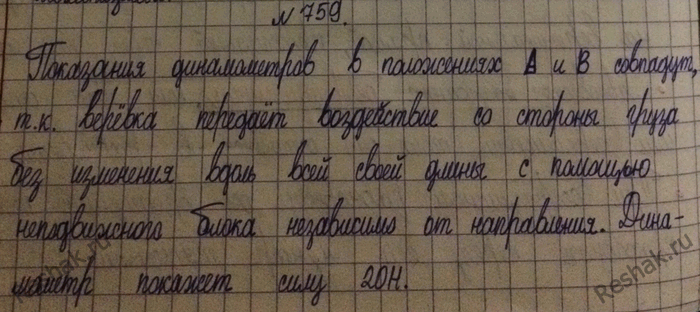 759. Каковы должны быть показания динамометров в положениях А и В (рис. 216)? (Груз не движется.) 1) Неподвижный блок не дает выигрыш в силе независимо от направления прикладываемой силы;