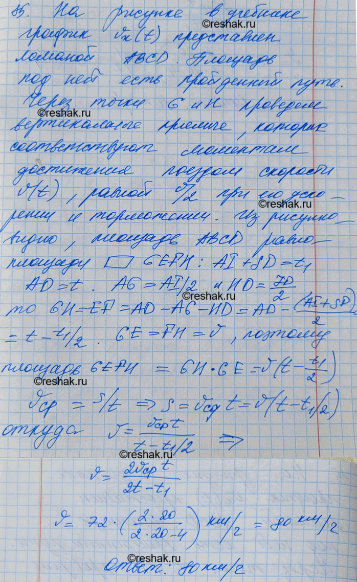 Расстояние между двумя станциями поезд прошел со средней скоростью vср = 72 км/ч за t = 20 мин. Разгон и торможение вместе длились t1 = 4 мин, а остальное время поезд двигался равномерно. Какой была скорость v поезда при равномерном движении?