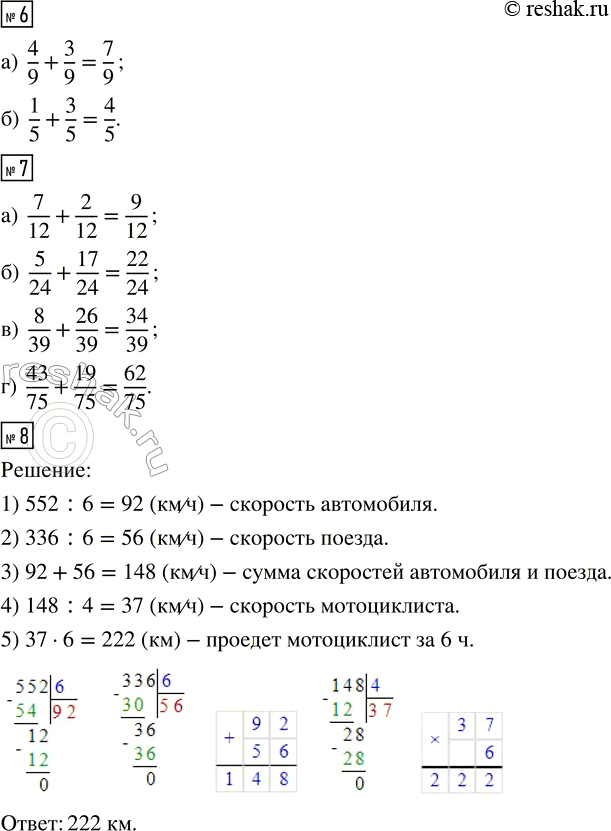 а) 7/12 + 2/12 б) 5/24 + 17/24 в) 8/39 + 26/39 г) 43/75 + 19/75