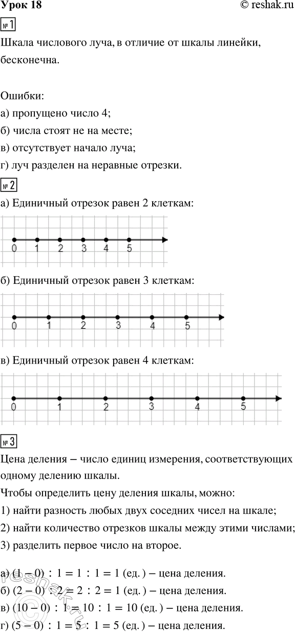1. Чем отличается шкала числового луча от шкалы линейки? Найди ошибки в изображении числового луча: 2. Построй числовой луч, выбрав за единичный отрезок: