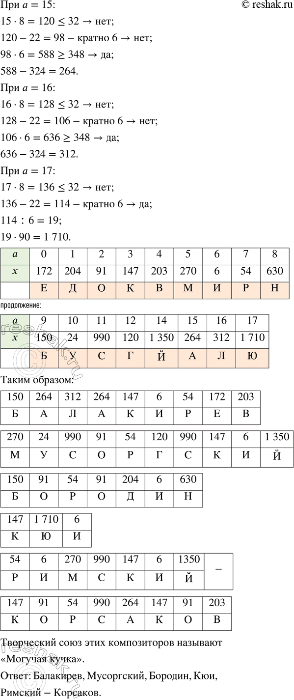 15. Используя заданный алгоритм, найди значения х, сопоставь их соответствующим буквам и расшифруй фамилии известных русских композиторов, живших в середине XIX века. Всех их связывала тесная дружба, а уважение к их таланту было настолько большим, что группа этих композиторов получила специальное название. Узнай, как называют творческий союз этих композиторов.