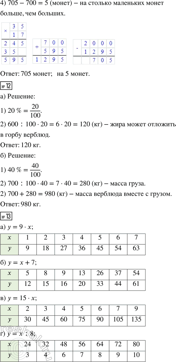 12. а) Верблюд может отложить в горбу жир, который он использует затем при недостатке корма. Масса этого жира достигает 20 % массы верблюда. Какое максимальное количество жира может отложить в горбу верблюд, если его масса равна 600 кг?