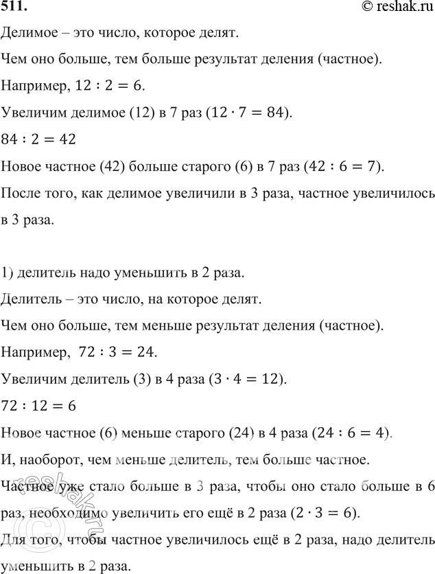 511. Делимое увеличили в 3 раза. Как надо изменить делитель, чтобы частное: 1) увеличилось в 6 раз; 2) уменьшилось в 6 раз;
