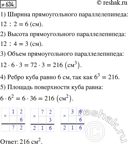634. Куб и прямоугольный параллелепипед имеют равные объёмы. Найдите площадь поверхности куба, если длина прямоугольного параллелепипеда равна 12 см, что в 2 раза больше ширины и в 4 раза больше высоты параллелепипеда.