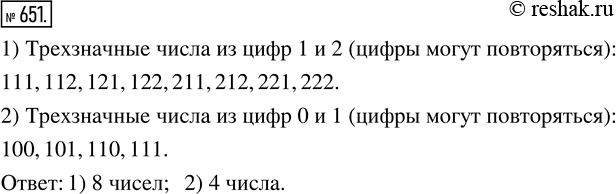 651. Сколько различных трёхзначных чисел можно составить из цифр: 1) 1 и 2; 2) 0 и 1? (Цифры могут повторяться.) Комбинаторные задачи – это задачи, решение которых требует рассмотрения и подсчёта всех возможных случаев, или, как ещё принято говорить, всех возможных комбинаций.