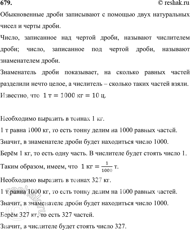 679. Выразите в тоннах: 1 кг; 327 кг; 58 кг; 1 ц; 3 ц. Обыкновенные дроби записывают с помощью двух натуральных чисел и черты дроби.