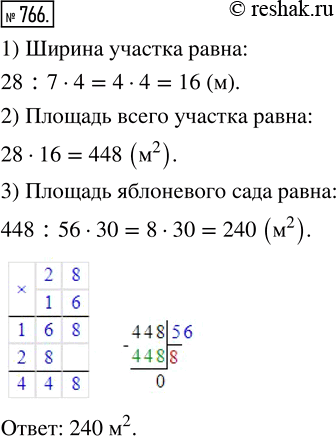 766. У фермера Петра Грушина есть участок земли прямоугольной формы. Длина участка равна 28 м, что составляет 7/4 его ширины. На площади, равной 30/56 всего участка, фермер разбил яблоневый сад.
