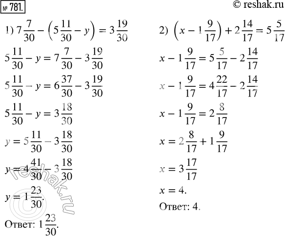 781. Решите уравнение: 1) 7 7/30 - (5 11/30 - y) = 3 19/30; 2) (x - 1 9/17) + 2 14/17 = 5 5/17.