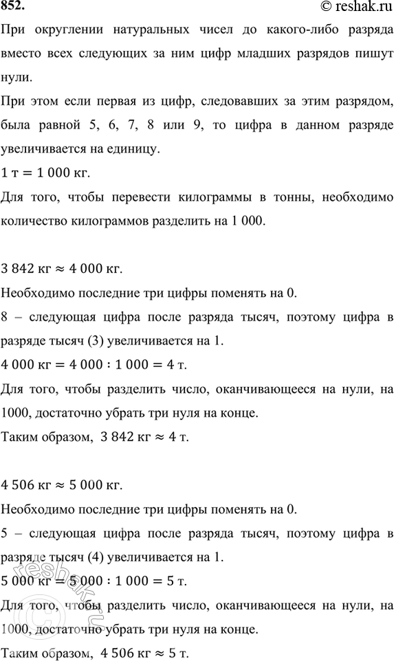 852. Запишите в тоннах, предварительно округлив до тысяч килограммов: 3 842 кг; 4 506 кг; 8 329 кг; 869 кг. При округлении натуральных чисел до какого-либо разряда вместо всех следующих за ним цифр младших разрядов пишут нули.