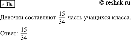 314. В классе 34 учащихся, из них 15 — девочки. Какую часть учащихся класса составляют девочки?