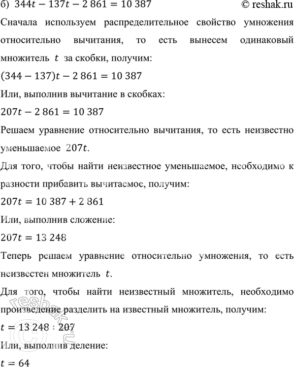 3.291. Найдите корень уравнения: а) 6x + 2x + 97 = 1561; б) 344t - 137t - 2861 = 10 387;