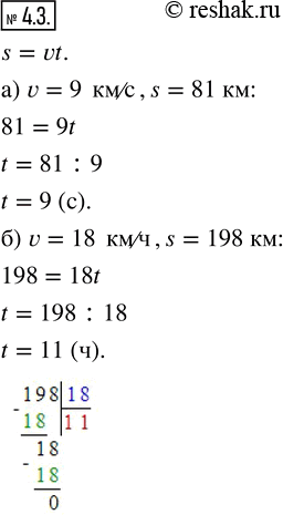 4.3. Вычислите по формуле пути время, если: а) v = 9 км/с, s = 81 км; б) v = 18 км/ч, s = 198 км.