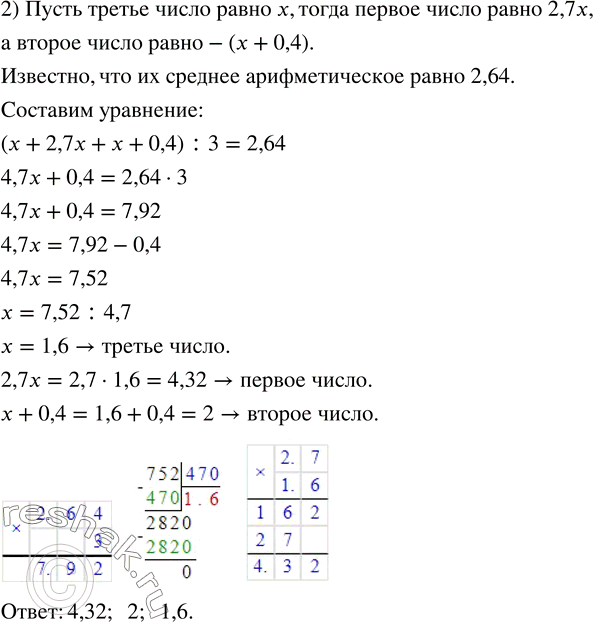2) Среднее арифметическое трёх чисел равно 2,64. Найдите эти числа, если первое число в 2,7 раза больше третьего, а второе на 0,4 больше первого.