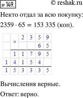 149. Из «Арифметики» Л. Ф. Магницкого. Некто купил зерна 2359 четвертей, за четверть платил по 65 коп. и отдал всех денег 153 335 коп. Проверьте вычисления.