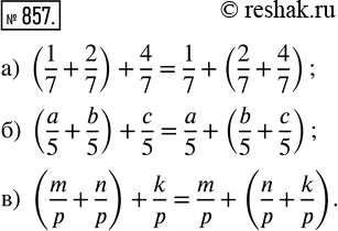 857. Запишите сочетательный закон сложения для чисел: а) 1/7, 2/7, 4/7; б) a/5, b/5, c/5; в) m/p, n/p, k/p.