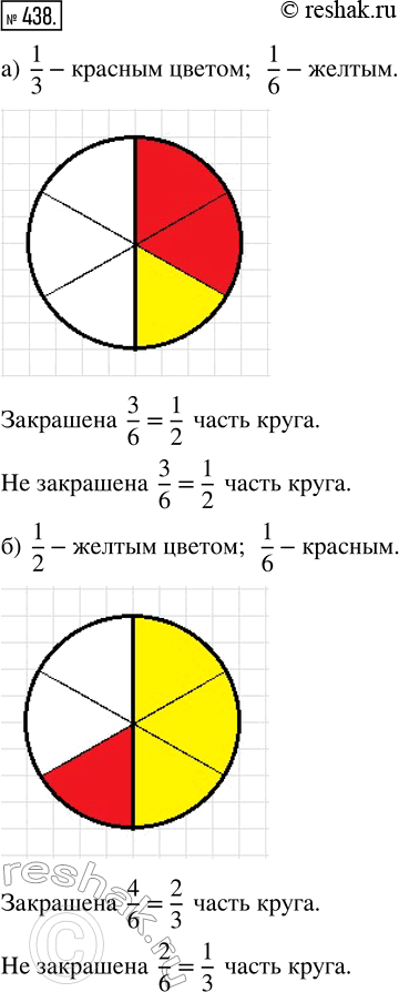 438. Начертите две окружности и проведите в них диаметры так же, как на рисунке 80. а) Закрасьте 1/3 первого круга красным цветом, 1/6 — жёлтым.