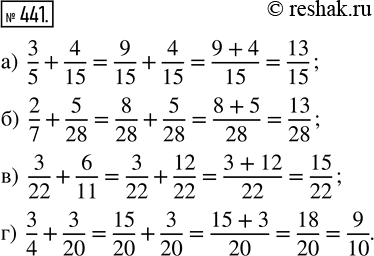 441. Вычислите: а) 3/5 + 4/15; б) 2/7 + 5/28; в) 3/22 + 6/11; г) 3/4 + 3/20.