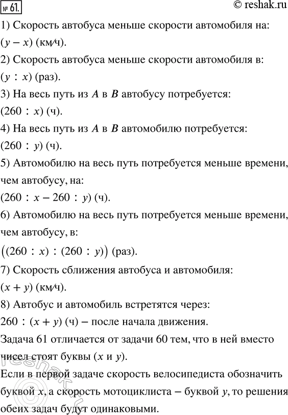 61. Из пунктов А и В, расстояние между которыми 260 км, одновременно навстречу друг другу выехали автобус и автомобиль. Скорость автобуса — х км/ч, а скорость автомобиля — у км/ч (х 1) на сколько скорость автобуса меньше скорости автомобиля;