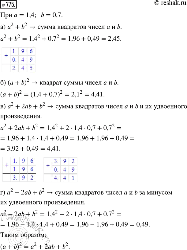 775. Прочитайте выражение и найдите его значение при а = 1,4 и b = 0,7: а) а^2 + b^2; б) (а + b)^2;