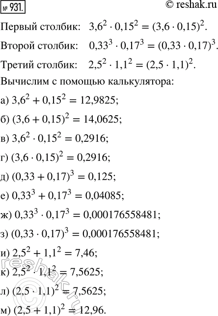 931. Не вычисляя, определите, значения каких выражений равны, и постарайтесь обосновать свой ответ: а) 3,6^2 + 0,15^2; д) (0,33 + 0,17)^3;