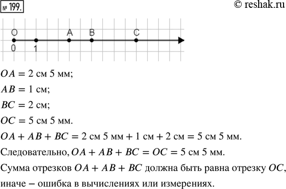 199. Начертить луч с началом в точке О. Отметить на нём последовательно от начала точки А, В и С. Измерить с точностью до 1 мм длины отрезков ОА, АВ, ВС и ОС. Найти ОА + АВ + ВС и сравнить эту сумму с длиной отрезка ОС. Если эта сумма не совпала с длиной отрезка ОС, найти объяснение несовпадению.