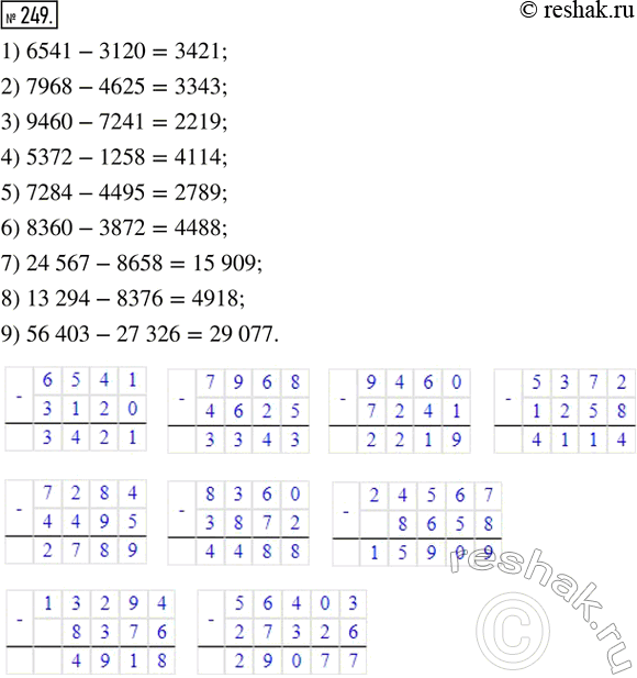 249. Вычислить: 1) 6541 - 3120; 2) 7968 - 4625; 3) 9460 - 7241; 4) 5372 - 1258; 5) 7284 - 4495;