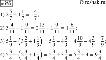 965. Вычислить: 1) 2 5/7 - 1 1/7; 2) 3 4/11 - 1 9/11; 3) 5 1/9 - (3 2/9 + 1 1/9);