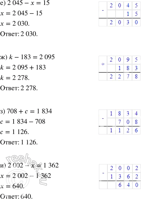 в) р + 207 = 1451; е) 2045 - х = 15; и) 2002 - х = 1362.