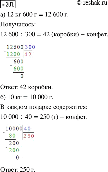 201. а) Расфасовали 12 кг 600 г конфет в коробки, по 300 г в каждую. Сколько коробок конфет получилось?