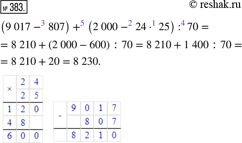 383. Вычислите: (9017 - 807) + (2000 - 24 · 25) : 70.
