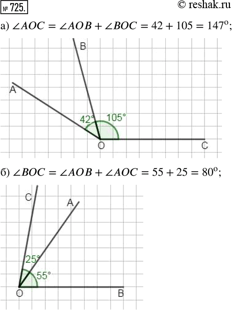 725. Начертите два угла с общей вершиной и общей стороной так, чтобы выполнялись следующие условия: а) ?AOB = 42°, ?BOC = 105°, ?AOC = 147°;