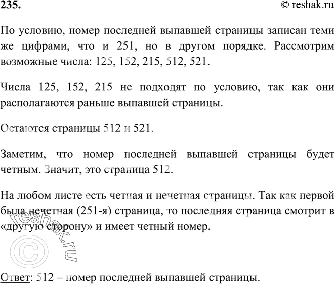 235 Из старинной книги выпала часть страниц, идущих подряд. Первая выпавшая страница имеет номер 251, а номер последней записан теми же цифрами в другом порядке.