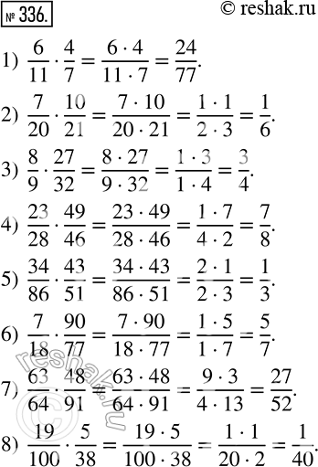 336 Найдите произведение: 1) 6/11* 4/7; 2) 7/20* 10/21; 3) 8/9* 27/32; 4) 23/28* 49/46; 5) 34/86* 43/51; 6) 7/18* 90/77;