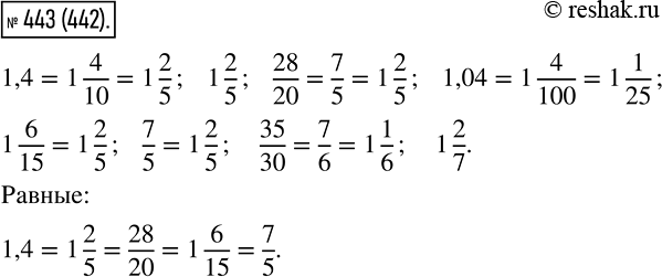 443 Найдите среди чисел: 1,4;1*2/5; 28/20;1,04;1*6/15; 7/5; 35/30;1*2/7 равные.