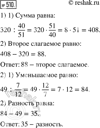 510. 1) Одно из двух слагаемых равно 320, что составляет 40/51 их суммы. Найдите второе слагаемое. 2) Найдите разность двух чисел, если вычитаемое равно 49, что составляет 7/12 уменьшаемого.
