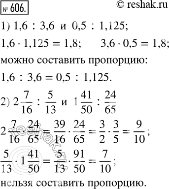 606 Не вычисляя данные отношения, установите, можно ли из них составить пропорцию: 1) 1,6 : 3,6 и 0,5 : 1,125; 2) 2*7/16 :5/13 и 1*4/50:24/65.