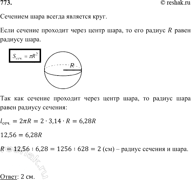 773 Длина окружности, ограничивающей сечение шара плоскостью, проходящей через его центр, равна 12,56 см. Чему равен радиус шара?