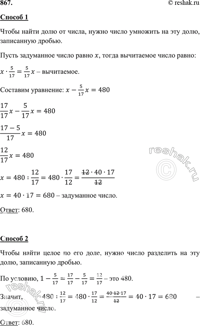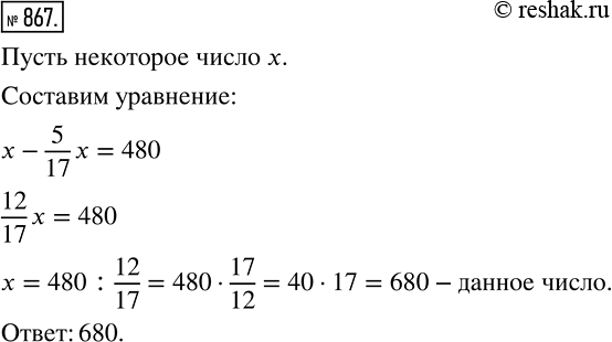 867.Из некоторого числа вычли 5/17 этого числа и получили 480. Найдите это число.