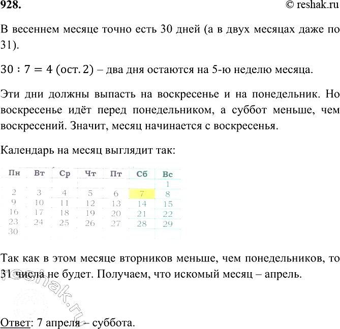 928. В некотором весеннем месяце понедельников больше, чем вторников, а воскресений больше, чем суббот. Какой день недели был 7-го числа этого месяца? Какой это месяц?