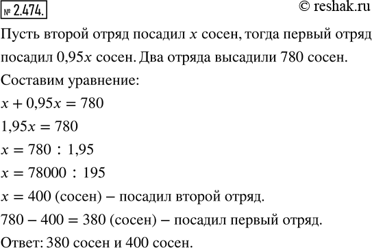 2.474. В День леса два отряда высадили саженцы 780 сосен, причём первый отряд высадил 95 % числа саженцев, высаженных вторым отрядом. Сколько сосен посадил каждый отряд?