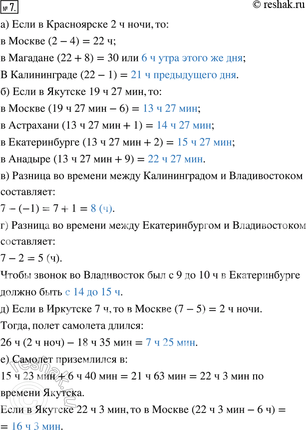 д) Самолёт вылетел из Москвы в 18 ч 35 мин по московскому времени и приземлился в Иркутске в 7 ч 00 мин по местному времени. Сколько времени длился полёт самолёта?
