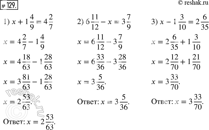 129. Решите уравнение. 1) x + 1 4/9 = 4 2/7; 2) 6 11/12 - x = 3 7/9; 3) x - 1 3/10 = 2 6/35.
