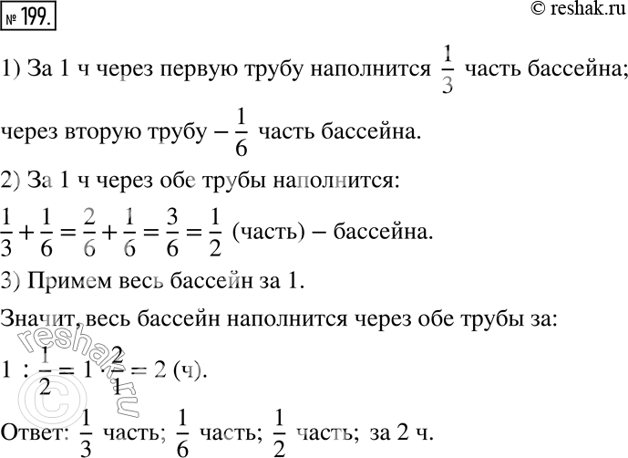 199. Через первую трубу бассейн можно наполнить водой за 3 ч, а через вторую — за б ч. Какая часть бассейна наполнится водой, если на 1 ч открыть только первую трубу? Только вторую трубу?