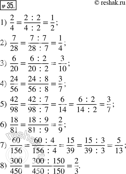 35. Сократите дробь: 1) 2/3; 2) 7/28; 3) 6/20; 4) 24/56; 5) 42/98; 6) 18/81; 7) 60/156; 8) 300/450.
