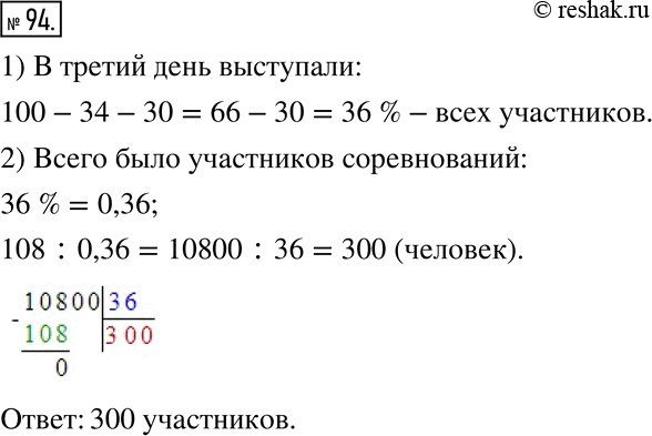 94. Спортивные соревнования проходили три дня. В первый день в них выступили 34 % всех участников, во второй день — 30 %, а в третий — остальные 108 человек. Сколько всего было участников соревнований, если известно, что каждый спортсмен выступал только в один из дней?