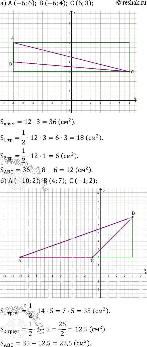 425. Найдите площадь треугольника ABC, если: а) A (-6;6); B (-6;4); C (6;3); б) A (-10;2); B (4;7); C (-1;2); в) A (-3;8);