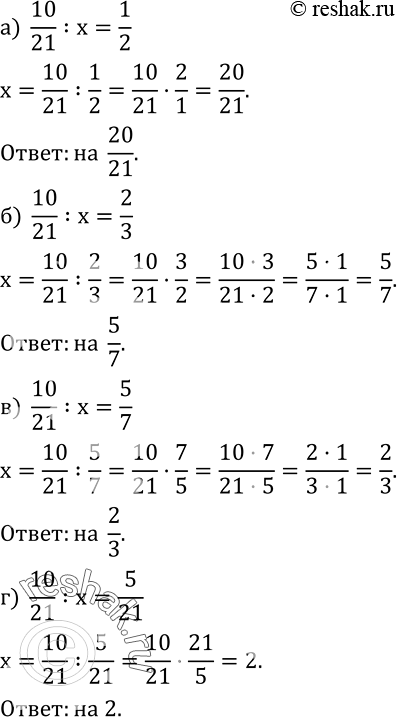 472. На какое число нужно разделить дробь 10/21, чтобы получить данное число: а) 1/2; б) 2/3; в) 5/7; г) 5/21?