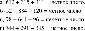 813. Не выполняя вычислений, определите, каким является значение выражения - четным или нечетным: а) 612+315+411; в) 78+641+96; б) 52+884+120; г) 744+291-345.